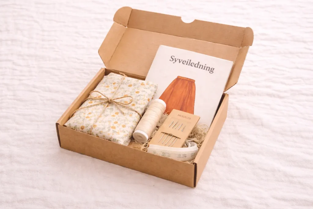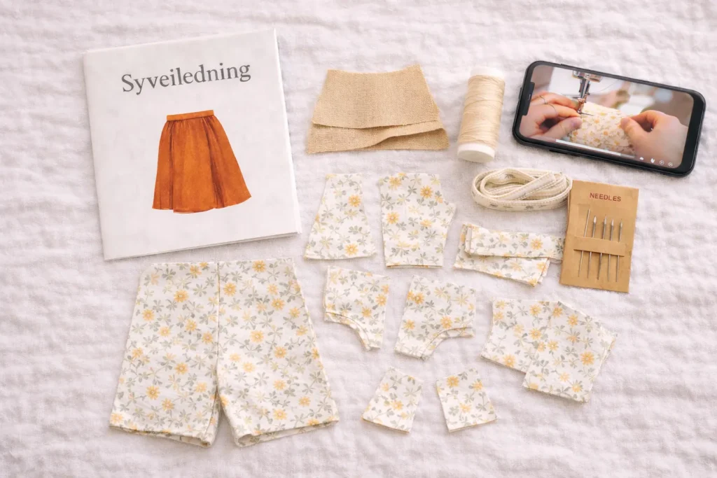 Stoff, nål, mønster, tråd, steg-for-steg hefte og profesjonell video. Vi klipper stoffet for deg, så du slipper den kjedelige jobben.