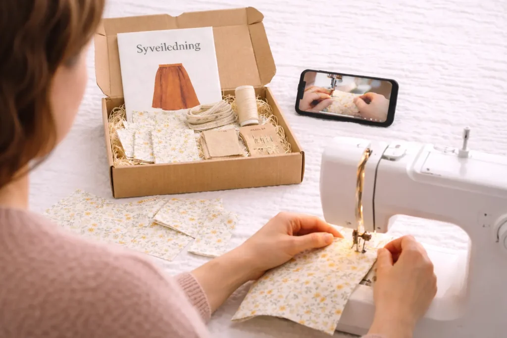Ferdige sypakker med alt inkludert: ferdigklippet stoff, nål, mønster, tråd, veiledningshefte og profesjonell video.